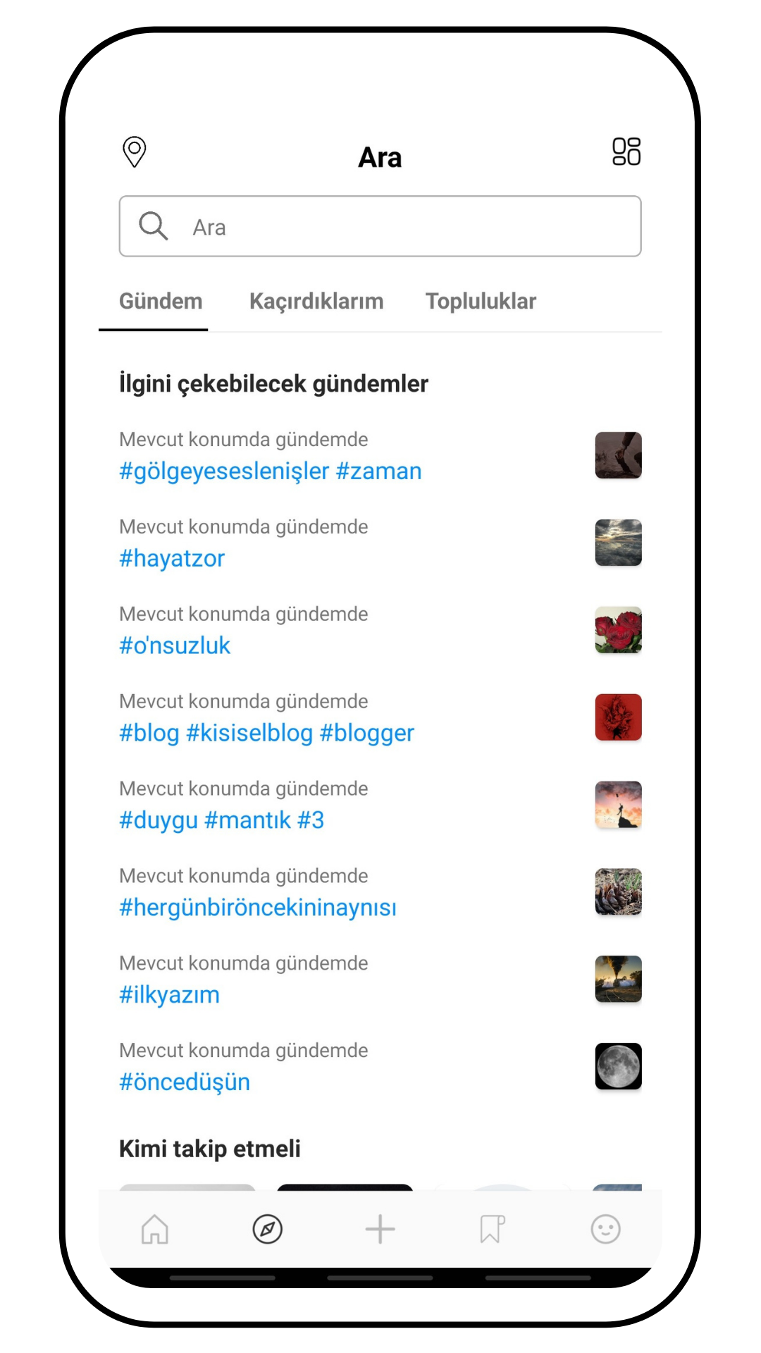 Son etkileşimlere ve kategorilere göre listelenen keşfet bölümü sizleri bekliyor.